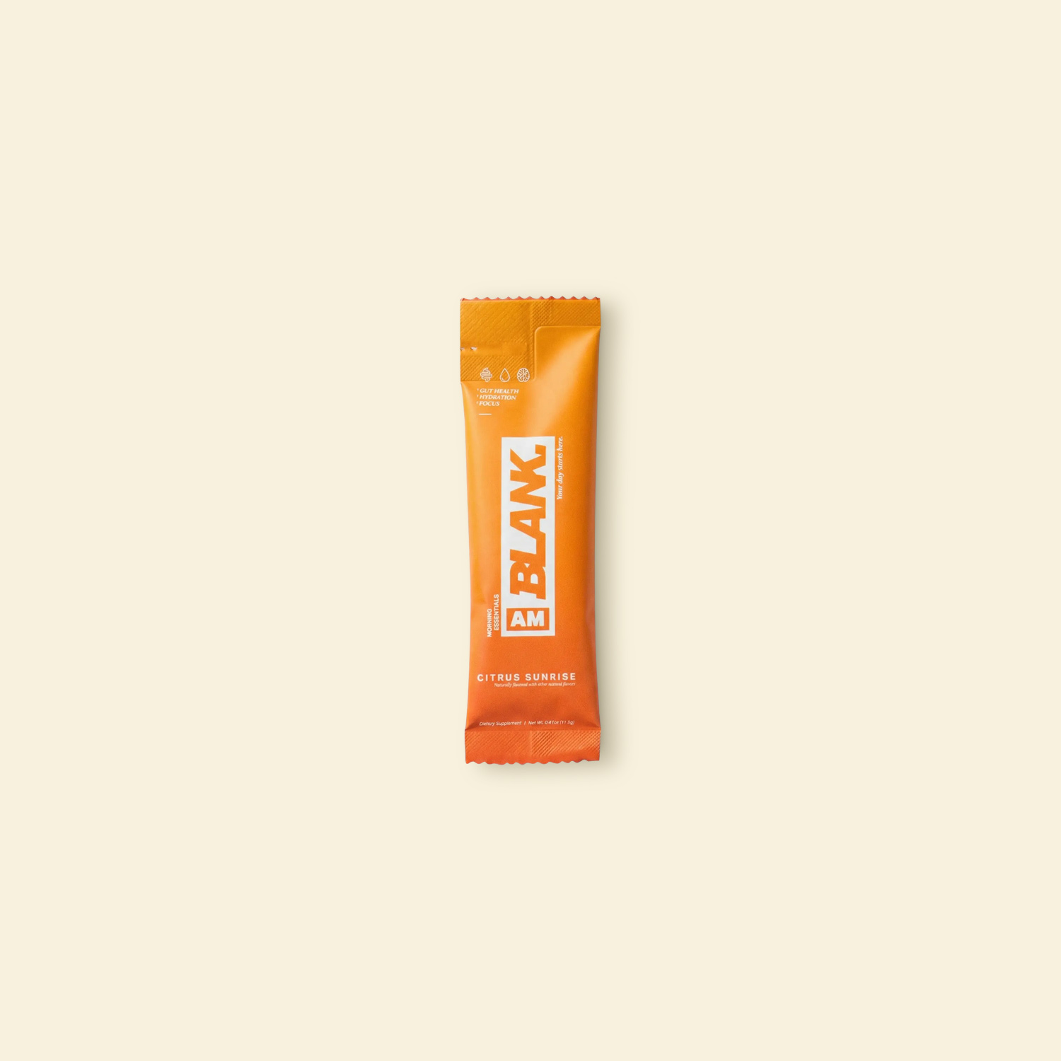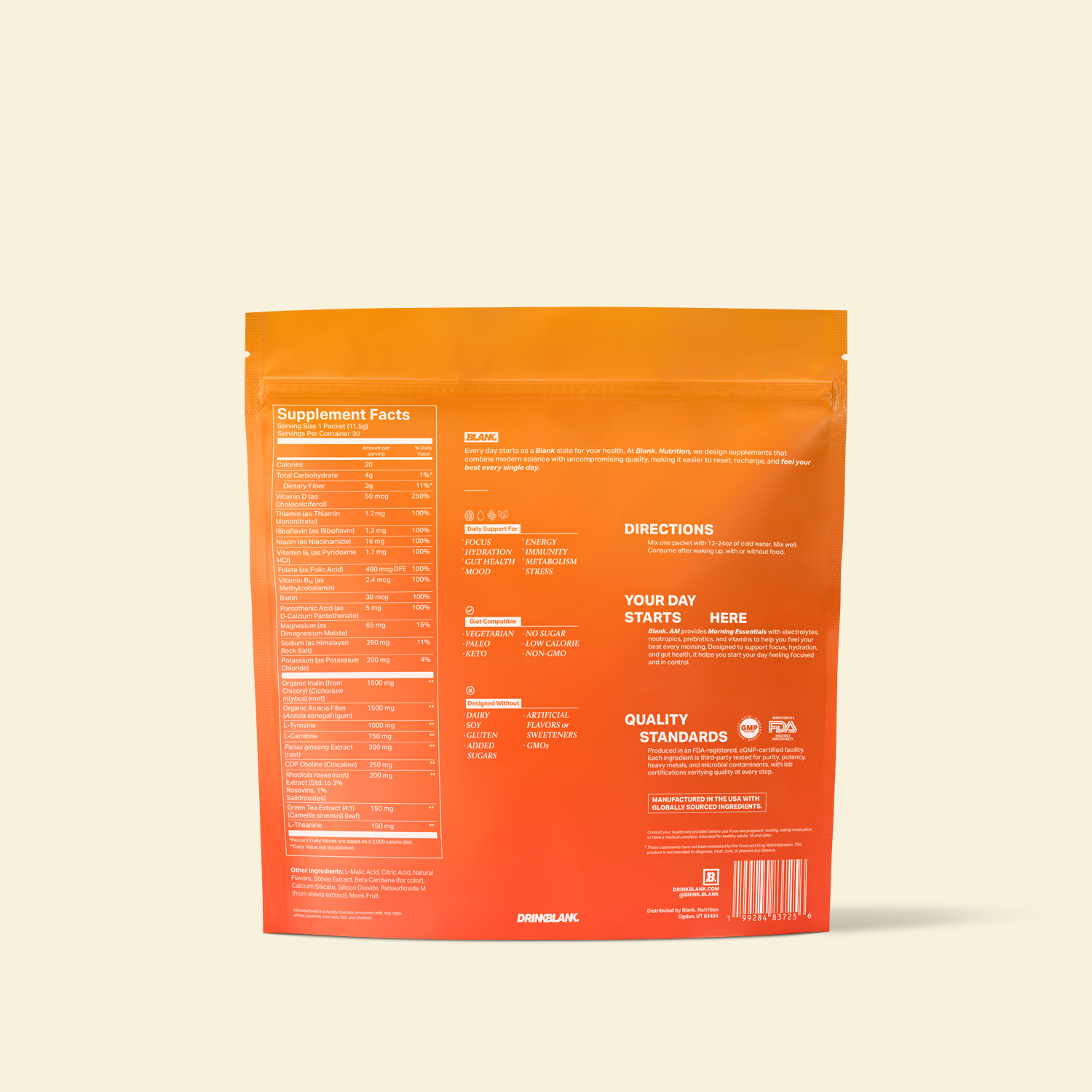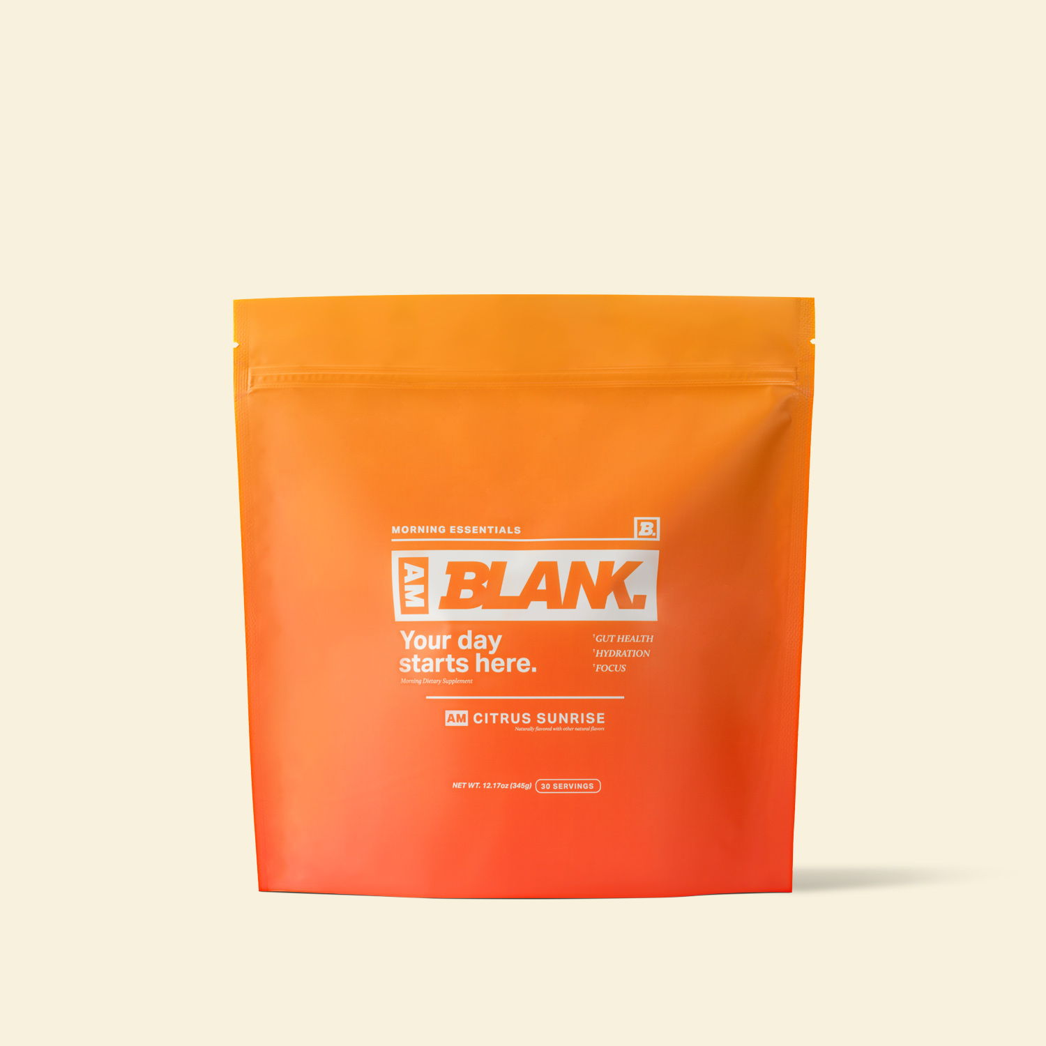 Blank. AM delivers electrolytes, nootropics, pre-biotics, and daily vitamins in one simple routine. A balanced and optimized morning supplement, for you to wake up and be ready for the day ahead without caffeine crash or jitters.